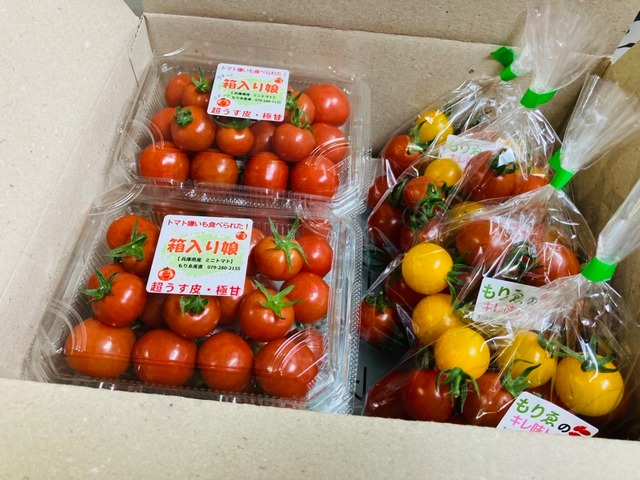 【 ミニ2種・大玉詰め合わせ 】 手土産やご挨拶用に大人気!! ミニと大玉どちらも食べたい方へ ◆商品内容◆ ◇ミニトマト 約300g 箱入り娘/キレ味トマト/あらかるトマト 上記より2種を詰合わせ 各1P ◇大玉トマト 約800g もりゑのトマト 6個 ◆商品説明◆ ●箱入り娘(ミニトマト) 繊細な薄い皮 小粒で甘い新感覚なミニトマト! 見た目はまるで宝石のような輝き さくらんぼのようなキュートな形 ●キレ味トマト(ミニトマト) 甘みと酸味が程よく キレ味バツグンのトマト! 食べ終わりの後味がサッパリ。 熟成することで甘みが変わる、 味変トマト! ●あらかるトマト(ミニトマト) 数種類のトマトの詰合せ 細長い甘さが優しいふらガール、りんごの形が可愛いあっぷる、 白い色が珍しいプリモホワイト、ちょっぴり大きくなり過ぎたキレ味トマト 味がしっかり黄色いトマトパルチェ 時期により何が入るかはお楽しみ!上記の中より2~3種類の詰合せ ●もりゑのトマト(大玉)糖度6~7 甘みと酸味のバランスがちょうど良い! 実は一番人気のもりゑ ※収穫時のサイズによりトマトの個数・内容は 若干変動する場合あり ※写真はイメージです。 シール・箱のデザイン等は変更する場合あり ※発送開始予定は目安となります。 収穫内容により発送にお時間をいただく場合がございます。 あらかじめご了承ください。